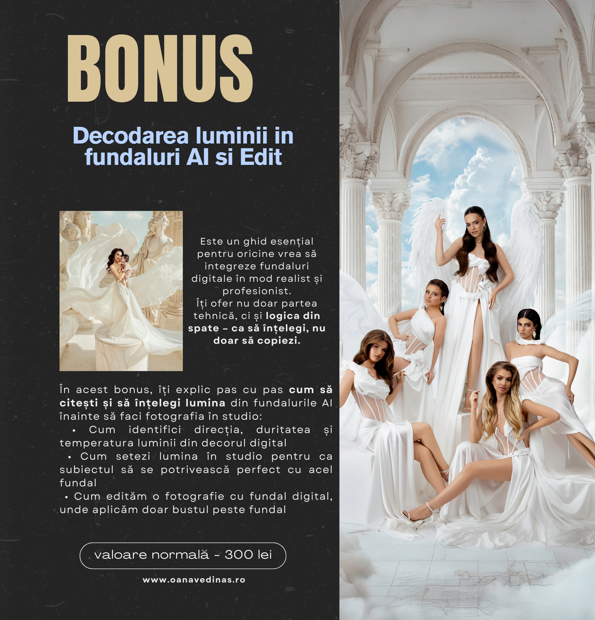 | Curs complet (4 sesiuni + bonus Lumina in fundaluri AI si edit) | Early bird: 1200 lei Standard: 1500 lei – full |